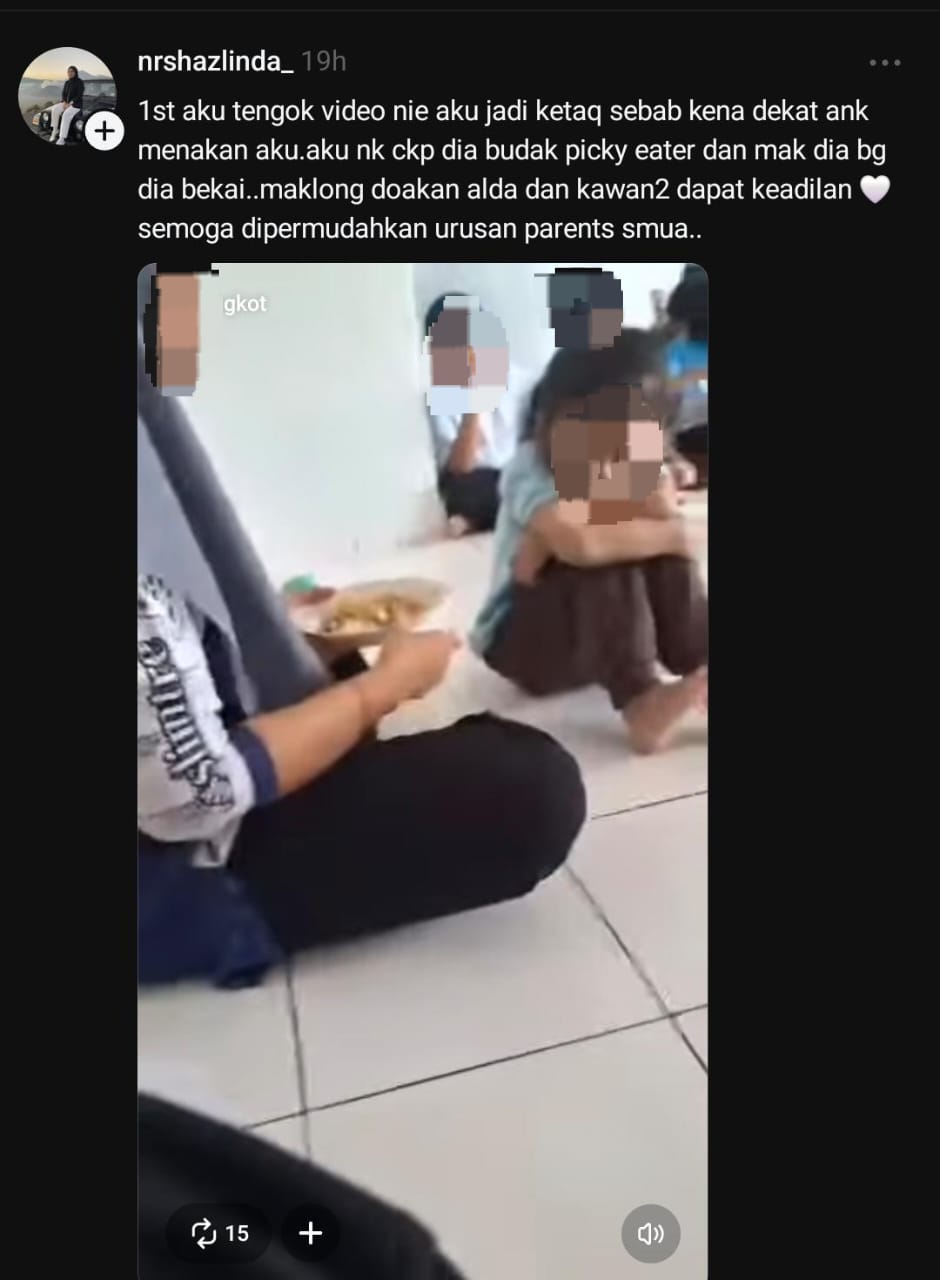 “Pertamanya lepas tengok video ni, aku jadi ketaq sebab kena dekat anak menakan aku. Aku nak cakap dia budak picky eater & mak dia ada bungkuskan bekal. Mak Long doakan Alda & kawan-kawan dapat keadilan. Semoga dipermudahkan urusan semua ibu bapa”