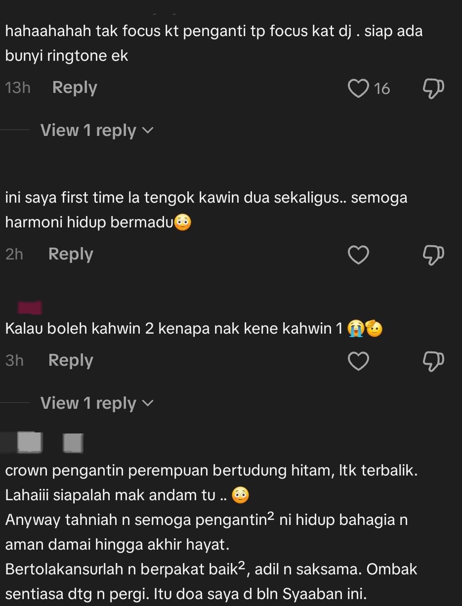 Menjengah ke ruangan komen, netizen juga merasa terkejut dan teruja melihat konsep persandingan seperti ini. Akan tetapi, mereka tetap menitipkan doa terbaik semoga perkahwinan itu bahagia sehingga ke akhir hayat. Rakaman persandingan tersebut telah meraih jutaan tontonan sejak dikongsikan sehari lalu.