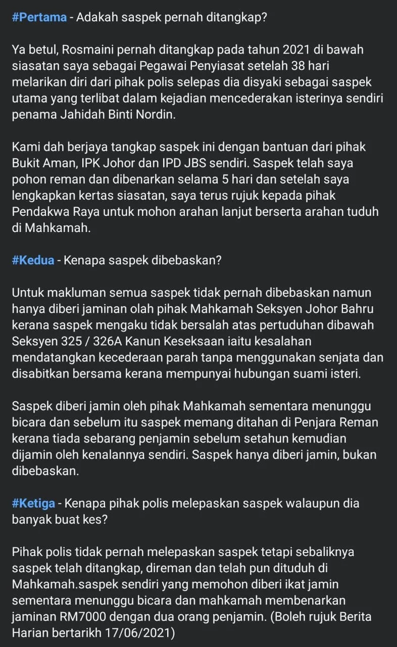 Tidak berdiam diri, Tuan Salaihudin Azual, selaku pegawai polis yang pernah menyiasat kes melibatkan Rosmaini dan bekas isteri, Jahidah Nordin, beberapa tahun lalu tampil mengeluarkan penjelasan lanjut. Sebelum ini, lelaki berkenaan memang sudah ditangkap pihak berkuasa dan sudah melalui proses pendakwaan atau pertuduhan di mahkamah. Dia bukanlah dibebaskan sepenuhnya, sebaliknya dibenarkan ikat jamin sementara menunggu keputusan di Mahkamah Rayuan.